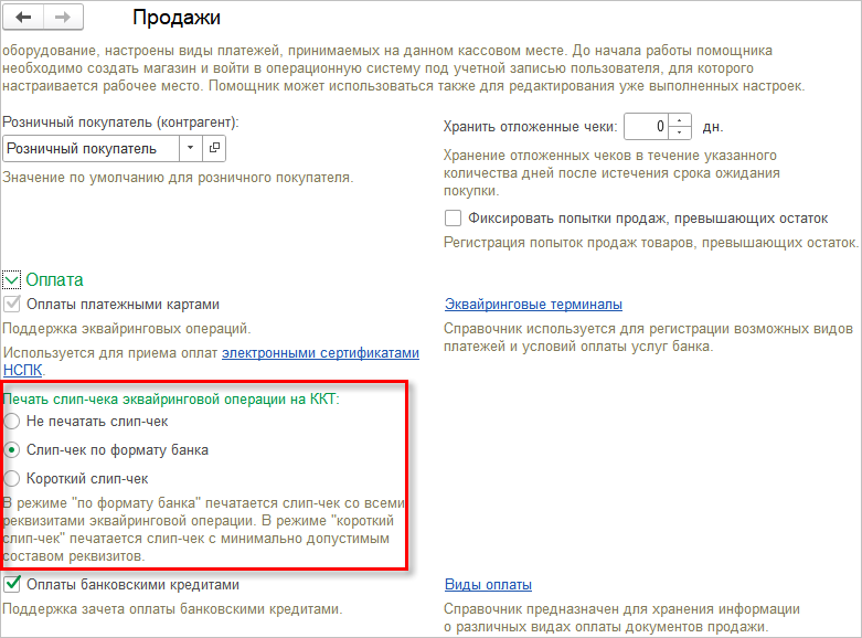 Настроить режим печати слип-чека можно в разделе Оплата (Администрирование - Продажи).