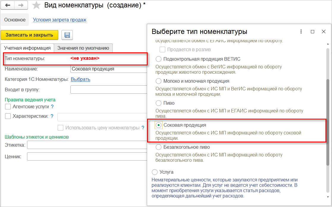 При создании нового вида номенклатуры необходимо выбрать соответствующий тип номенклатуры.