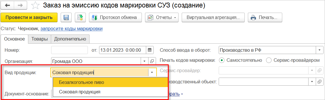 Также в документах ИС МП теперь доступны для выбора новые виды продукции.