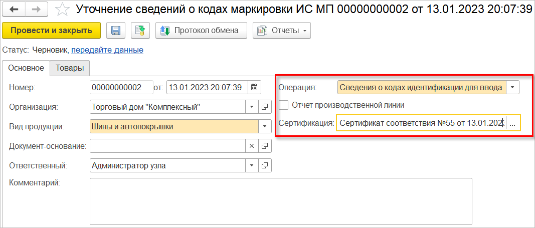 Для операции Сведения о кодах идентификации для ввода в оборот данные о сертификации указываются в шапке документа.