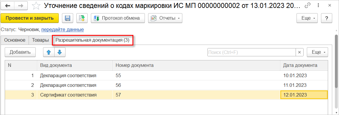 Для операции Сведения о разрешительной документации для ввода в оборот документы сертификации указываются в табличной части и относятся ко всем подобранным кодам маркировки.