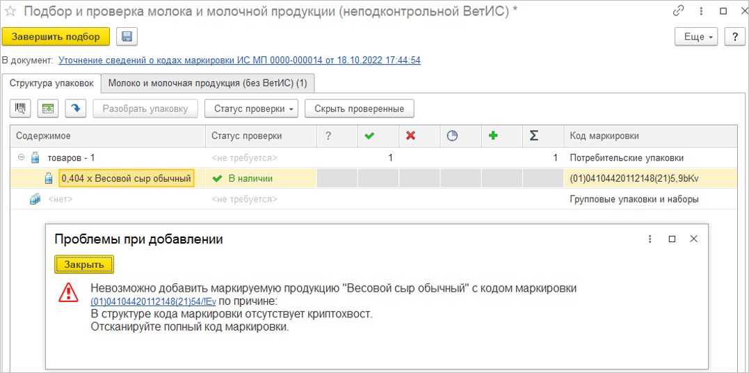 При подборе кодов для операции Отчет о перевзвешивании требуется сканировать полный код