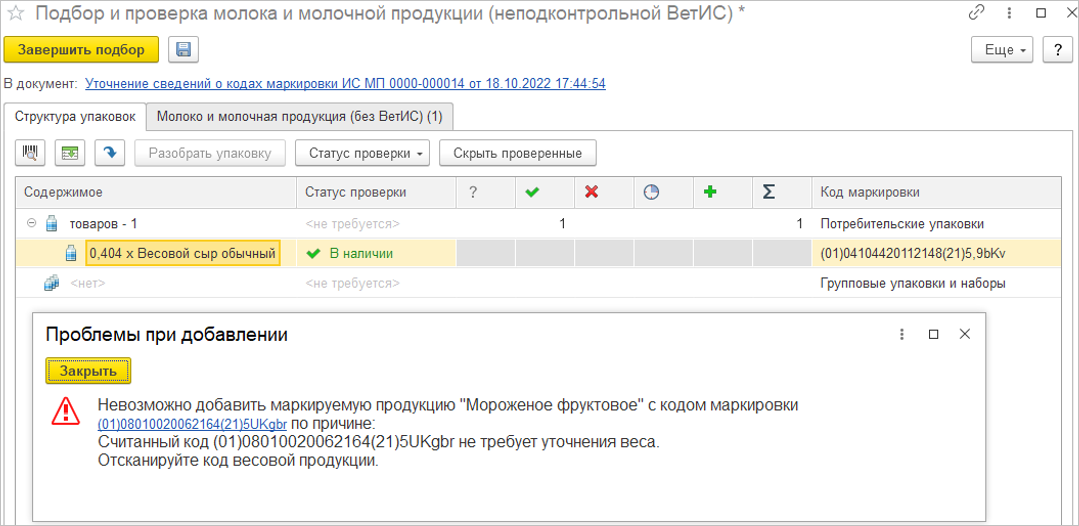 При подборе кодов для операции Отчет о перевзвешивании можно сканировать коды только весовой продукции.