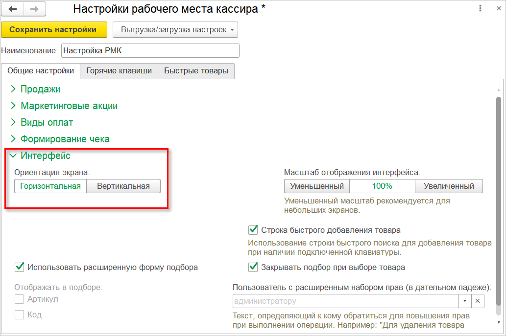 Для выбора ориентации монитора в разделе Интерфейс настроек РМК предназначен одноименный переключатель.