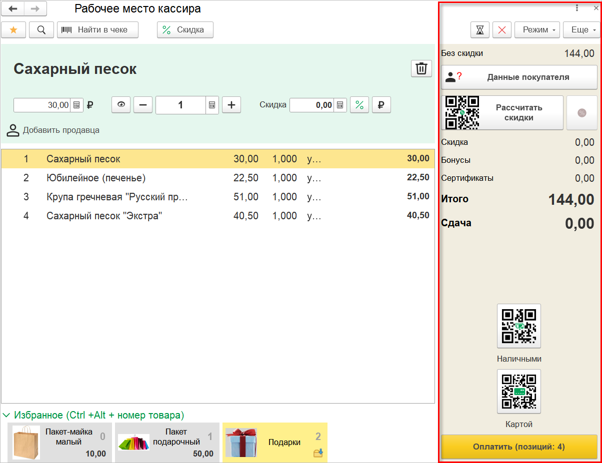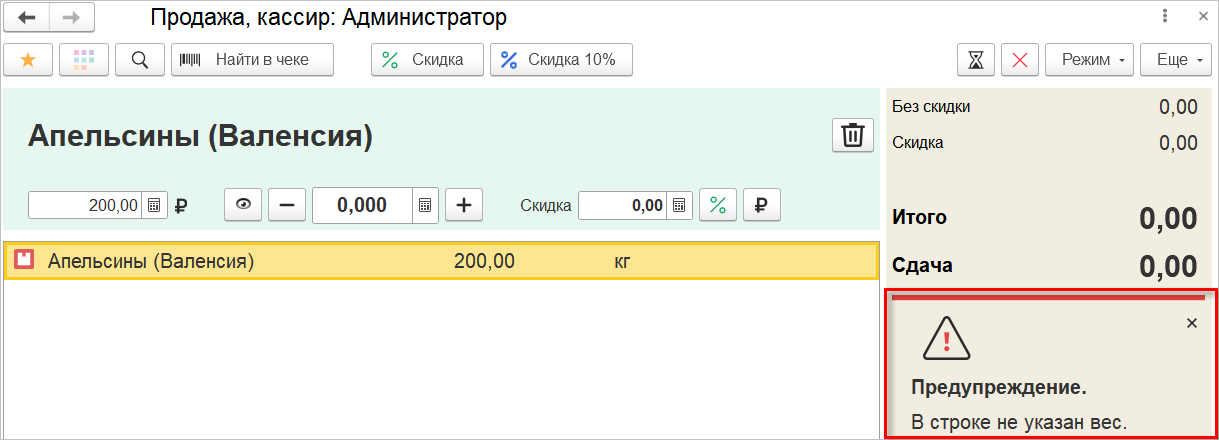 Если в корзине имеются товары, которые нельзя оплатить бонусами, и при этом выбрана бонусная карта, то в колонке суммы итоговой скидки будет отображено значение «0.00», выделенное красным цветом для привлечения внимания кассира.