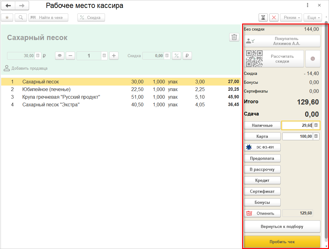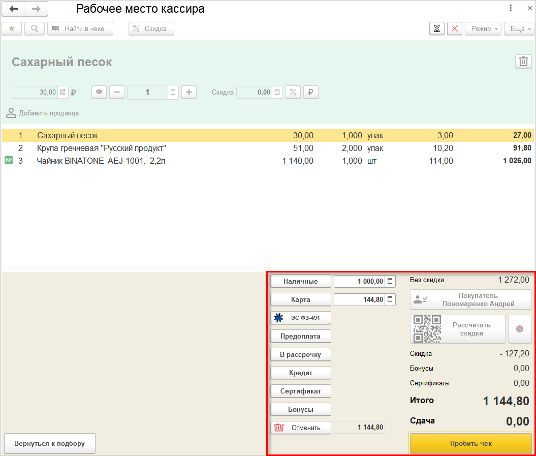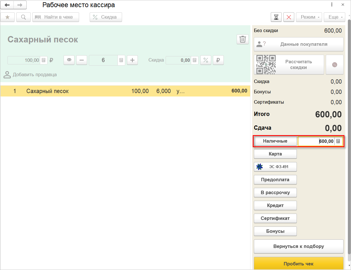 После этого автоматически будет выполнен переход в режим оплаты, где для выбранного способа оплаты будет заполнена сумма. Кассиру останется пробить чек с помощью одноименной команды.