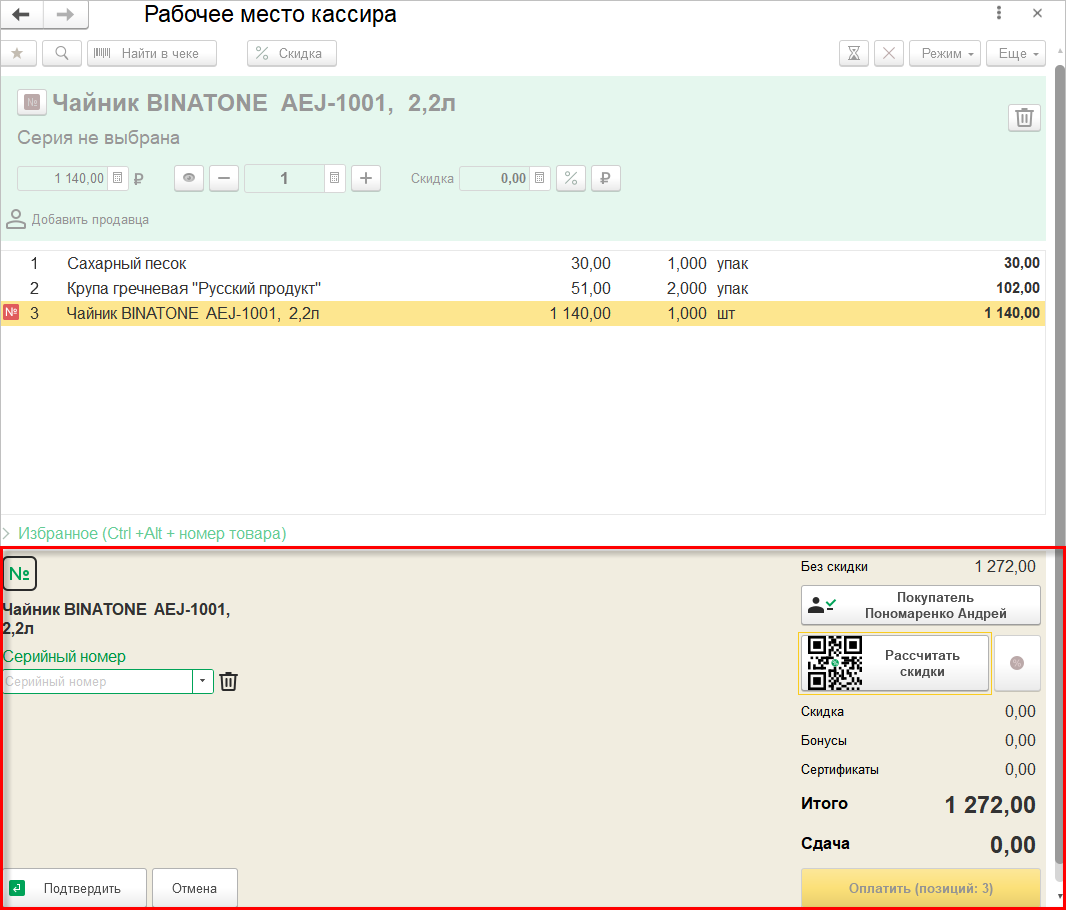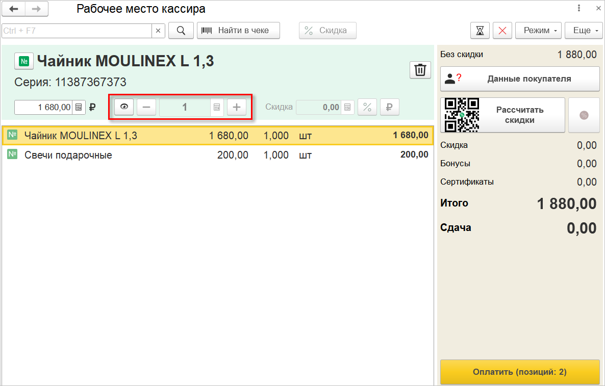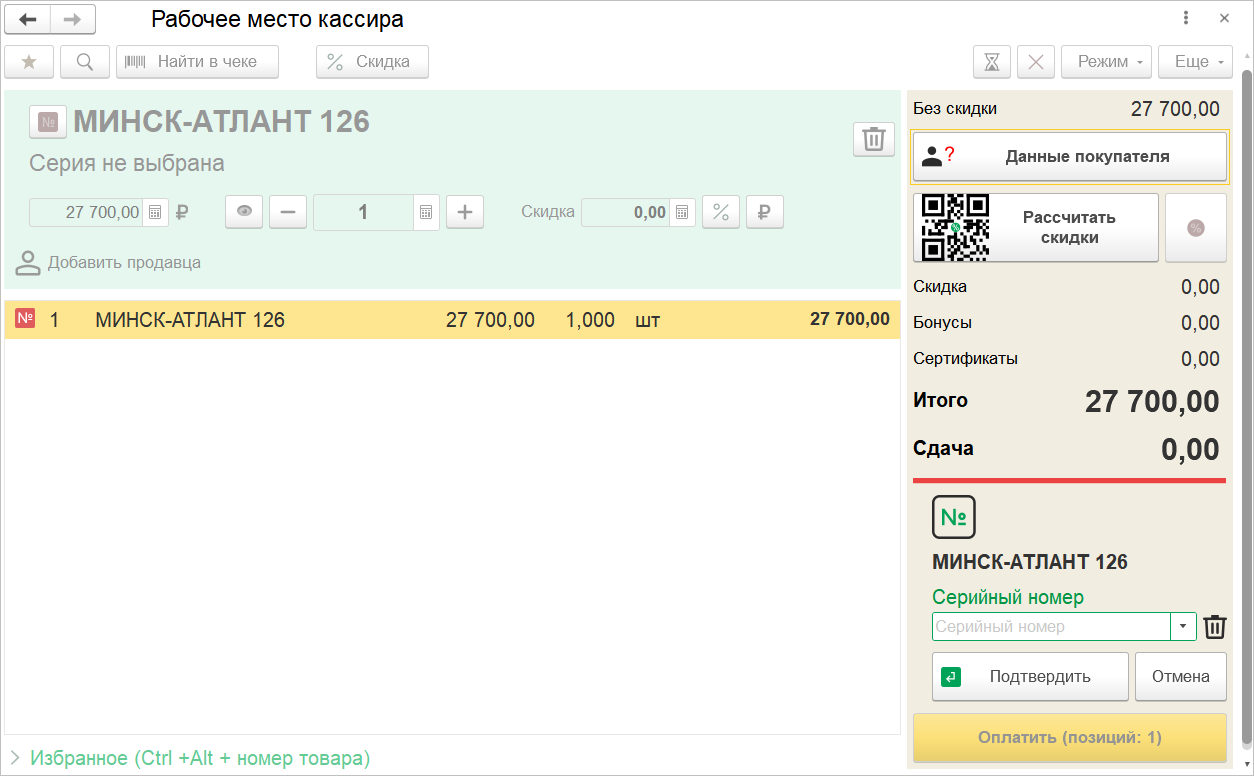 При добавлении неуникального серийного товара из каталога, по горячей клавише или сканированием штрихкода каждый раз добавляется новая строка, поэтому у кассира будет возможность указать другую серию. При этом в добавленной строке допускается менять количество.