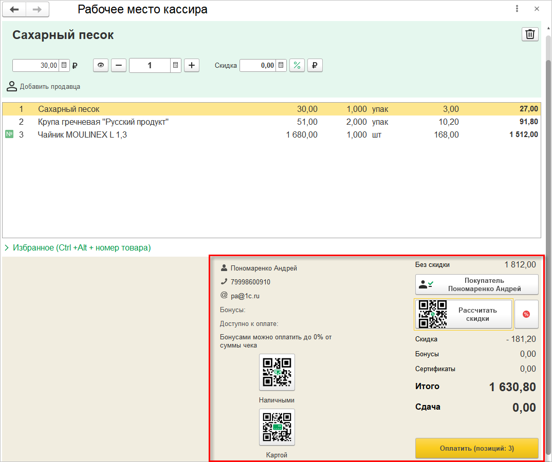 Здесь же можно посмотреть дополнительную информацию о выбранном покупателе и его дисконтной карте.
