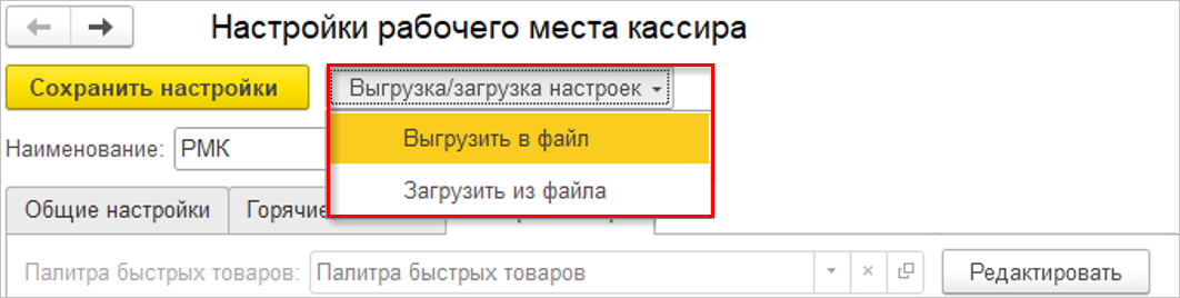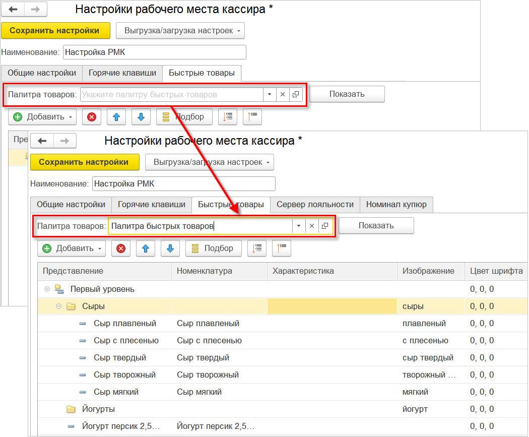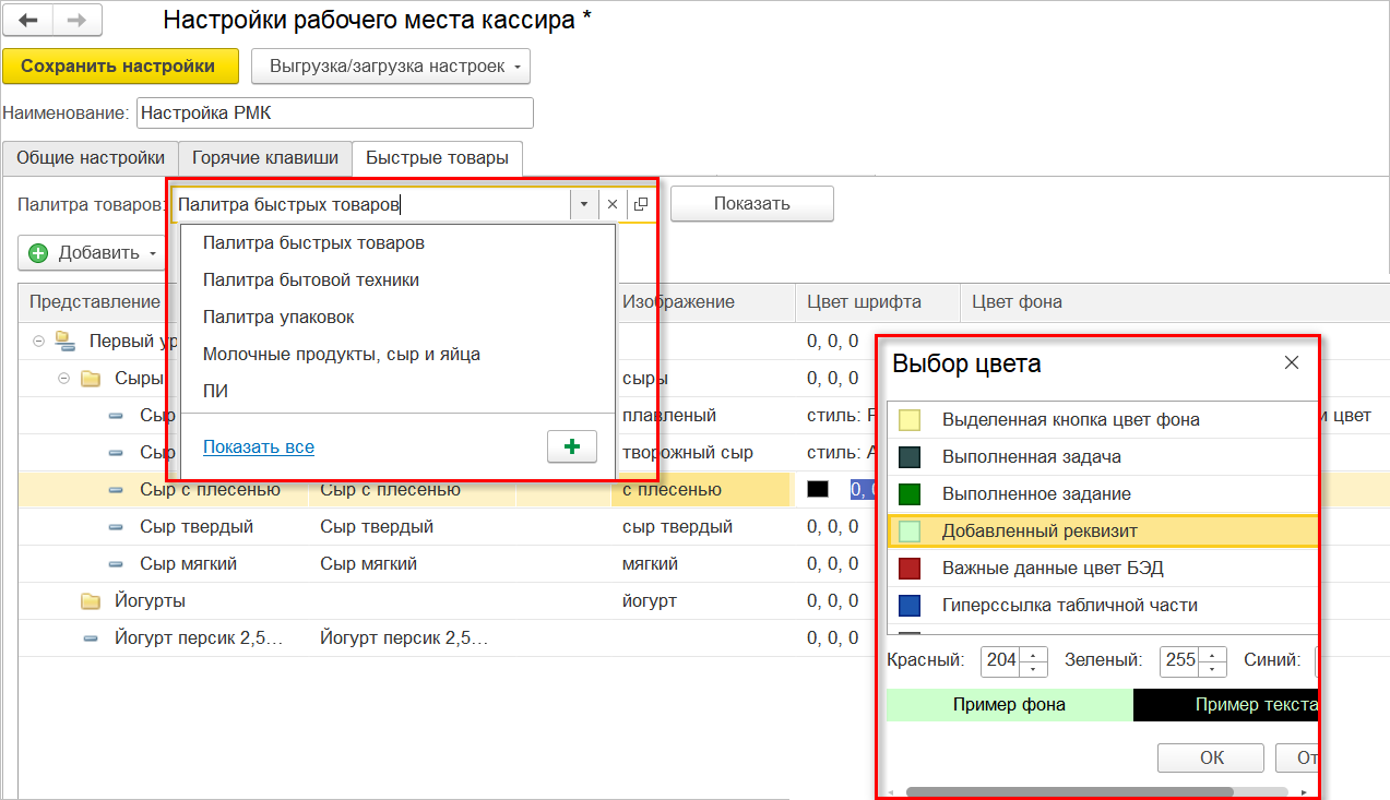 Если палитра товаров не выбрана, и при этом добавить элементы быстрых товаров, то при сохранении настройки «1С:РМК» произойдет создание новой палитры с этими элементами.