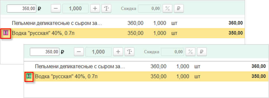 Визуально идентифицируются и товары с особенностями учета: маркируемые и серийные, сертификаты, подарки. Например, при вводе марки или номера сертификата значок изменит цвет с красного на зеленый.