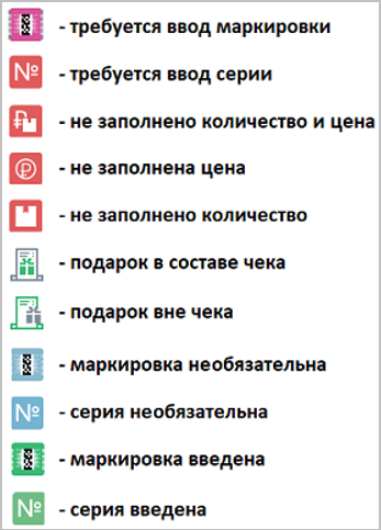 В списке товаров РМК появилась колонка, визуально отображающая дополнительную информацию о товаре и полноте ввода необходимых данных. Цветовое выделение значка позволит сначала оперативно привлечь внимание кассира к тем позициям, для которых требуются дополнительные действия, а затем проконтролировать правильность ввода данных.
