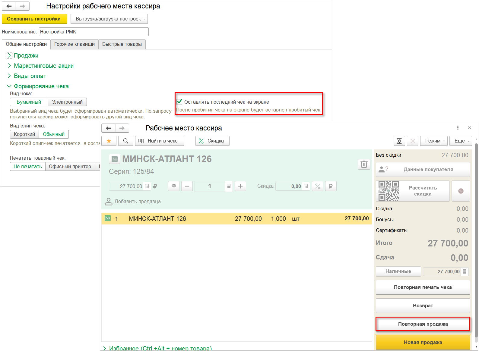 Если в разделе Формирование чека настроек РМК включена опция Оставлять последний чек на экране, то после пробития чека пользователь сможет выполнить повторную продажу.