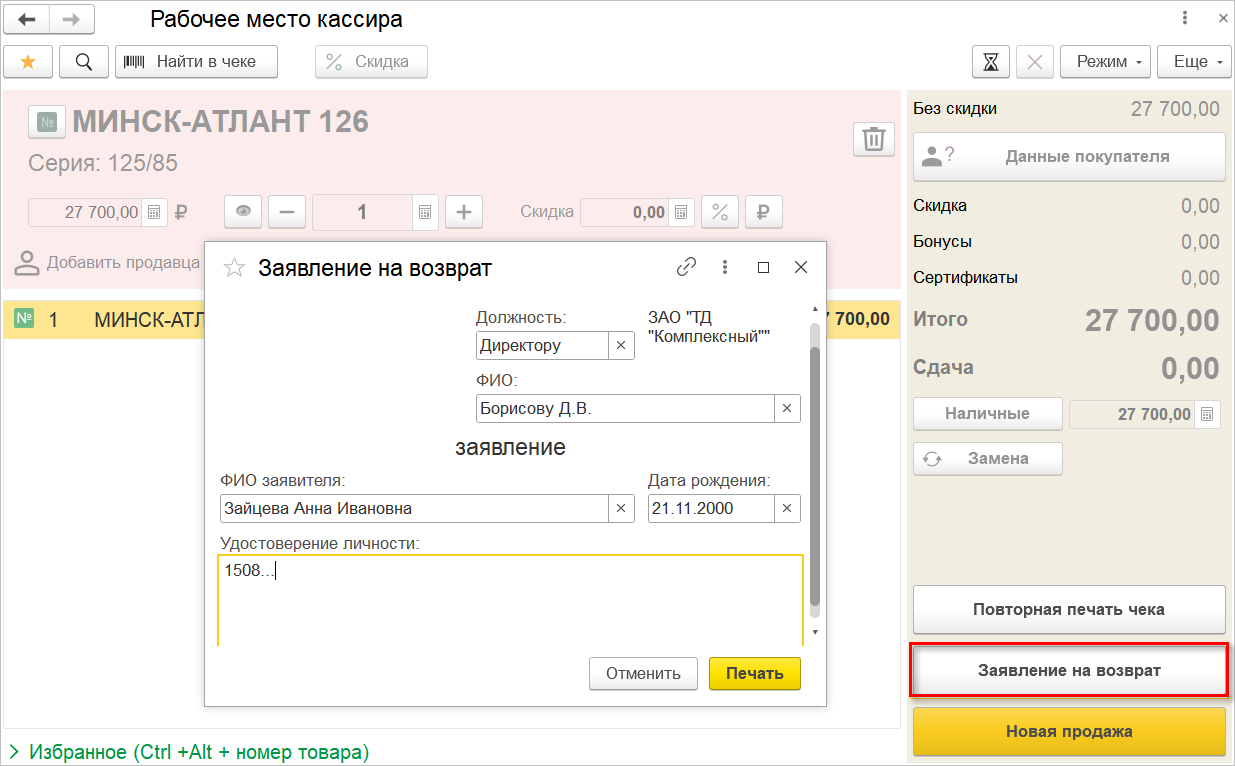 При оформлении возврата, с включенной опцией Оставлять последний чек на экране, у пользователей появилась возможность оформить и распечатать заявление на возврат.