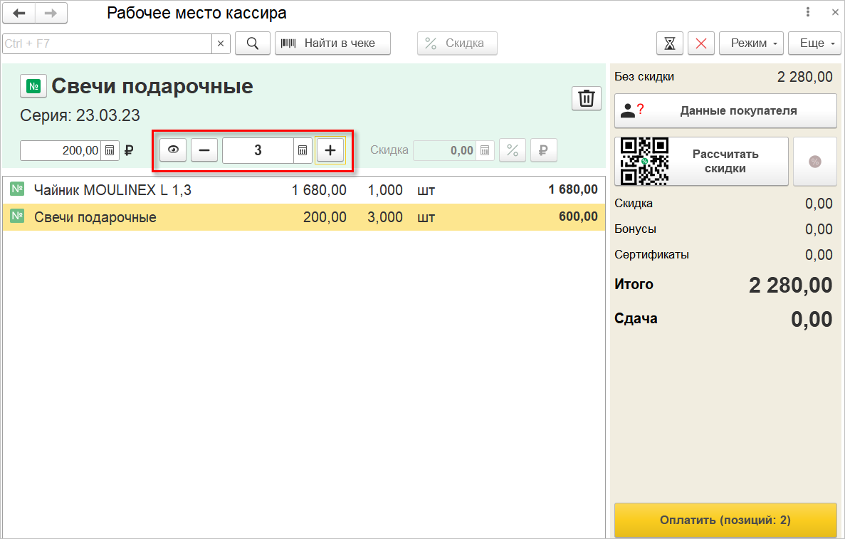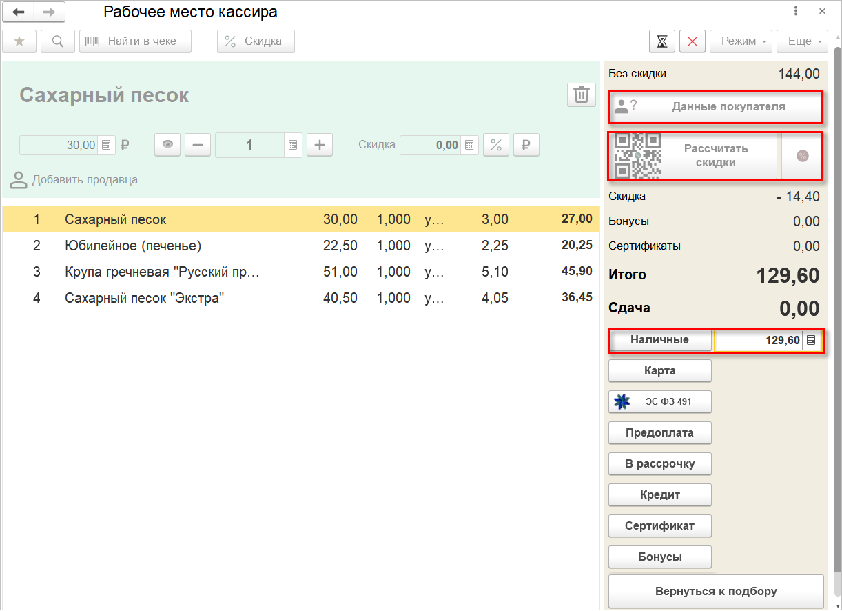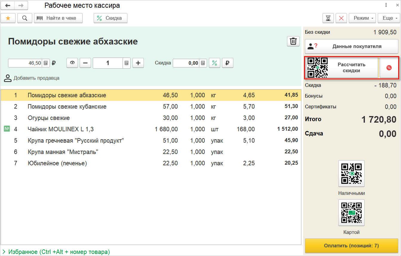 Теперь при оформлении продажи можно рассчитать скидки путем сканирования QR-кода, расположенного на кнопке Рассчитать скидки. При этом кассиру не потребуется переключаться в режим работы с мышью, что позволит оперативнее оформить оплату покупателя.