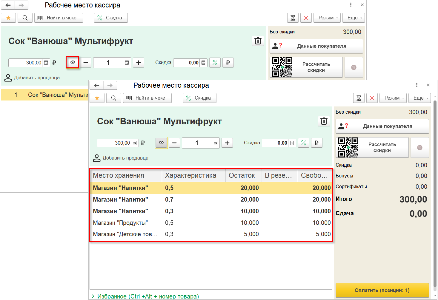 Сама кнопка Показать остатки примет вид «нажатой» кнопки серого цвета. Для выхода из режима показа остатков необходимо ее «отжать», изменить состав корзины, либо перейти к оплате.