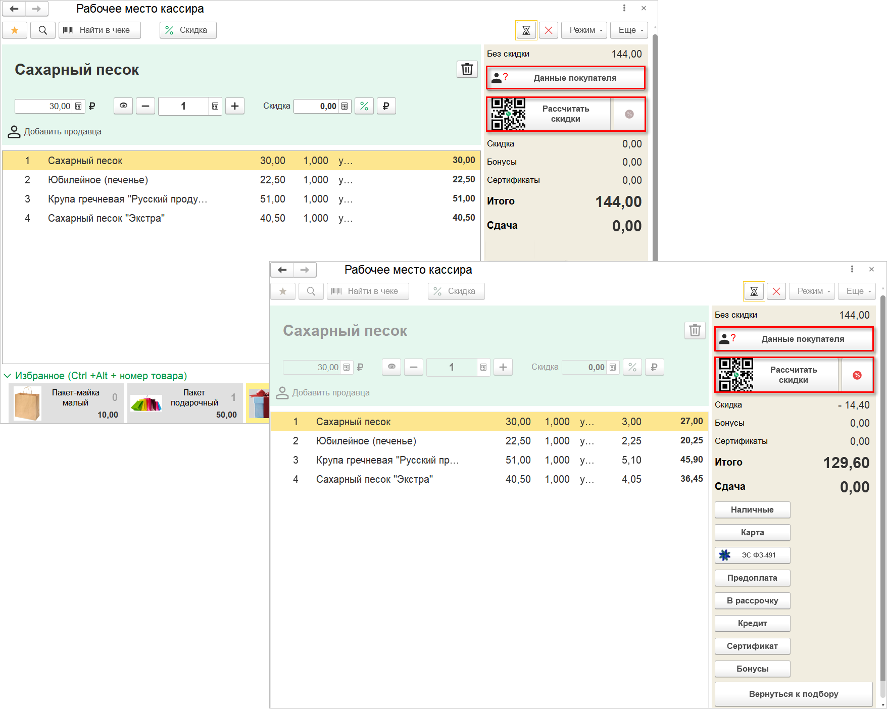 Сделали более понятной последовательность действий при вводе маркетинговых данных. Теперь пользователь может управлять скидками и картами лояльности не только на этапе ввода товаров, но и в режиме оплаты.