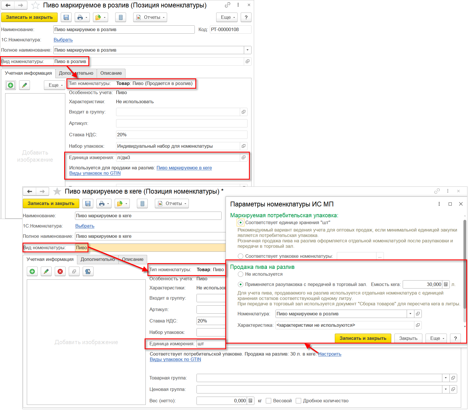 Аналогичным образом рекомендуется создать две карточки справочника "Номенклатура". Первую – для регистрации розничных продаж пива в розлив в "литрах" с указанием соответствующего вида номенклатуры. Вторую - для отражения операций в пивных кегах в "штуках" с видом номенклатуры без признака "Продается в розлив". Здесь же необходимо настроить параметры разупаковки, перейдя по гиперссылке "Настроить". В открывшейся форме нужно установить признак "Применяется разупаковка с передачей в торговый зал" и указать емкость кега в литрах. Также потребуется указать первую номенклатуру, которая будет использоваться для продажи в розлив. После сохранения данных информация о сопоставлении отобразится и в первой карточке номенклатуры. На закладке "Дополнительно" можно скорректировать сведения по алкогольной (спиртосодержащей) продукции.