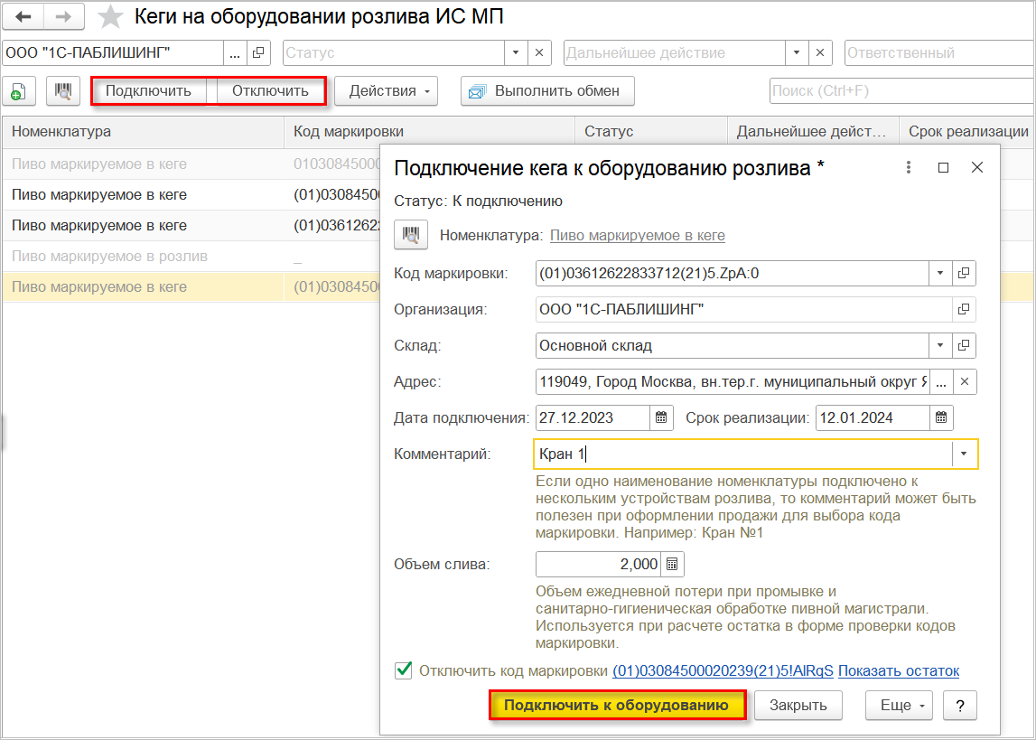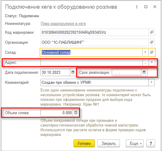 При сканировании или ручном вводе кода маркировки, не подключенного к оборудованию розлива, автоматически откроется форма подключения кега к оборудованию розлива.