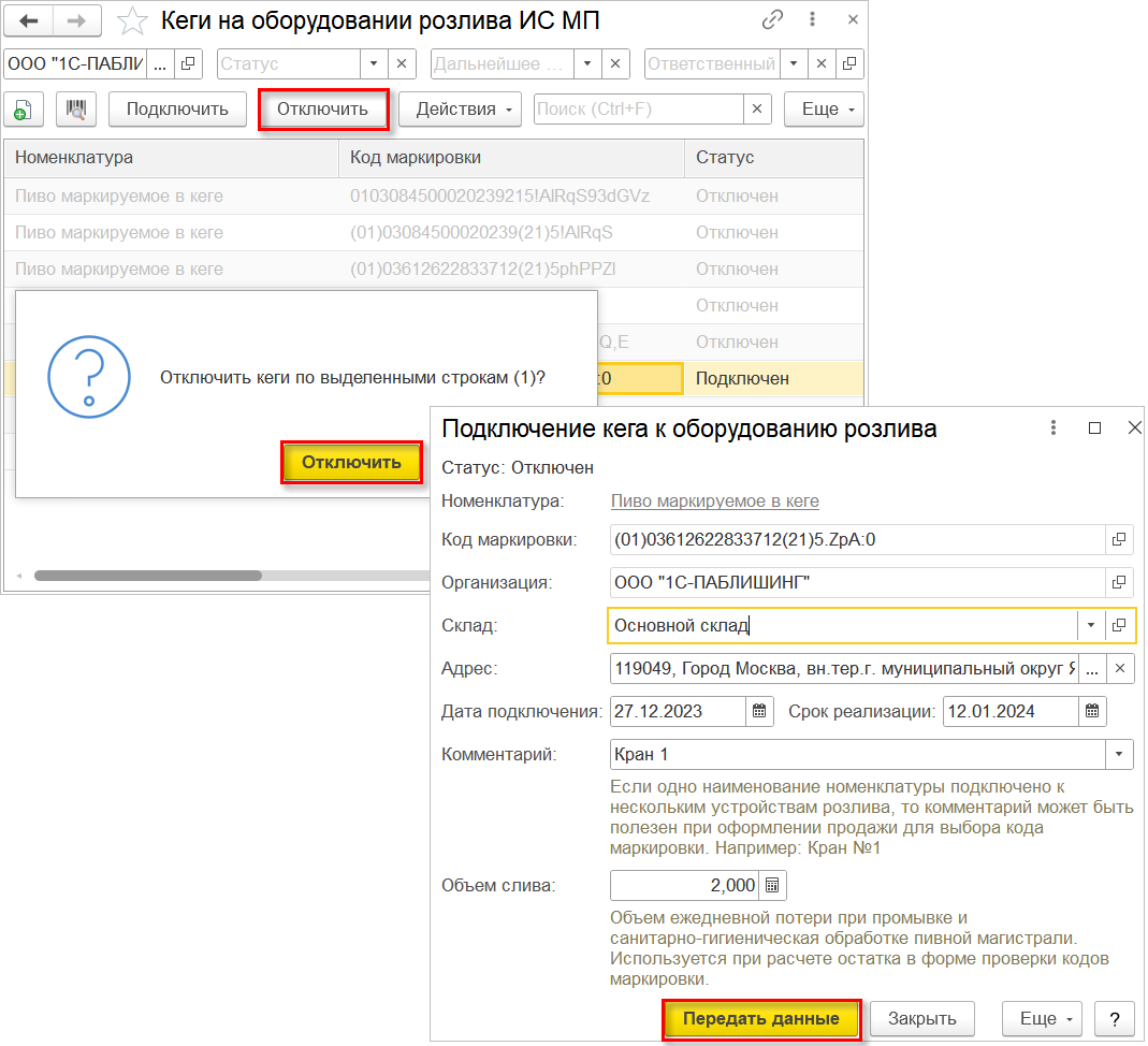 Отключить кег от крана можно автоматически при регистрации подключения нового кега или вручную, воспользовавшись командой «Отключить» в списке документов «Кеги на оборудовании розлива ИС МП». При этом потребуется указать конкретный кег, если подключено несколько, а затем передать данные в ГИС МТ.