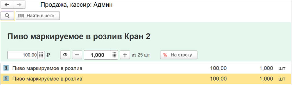 Для оформления розничной продажи используется номенклатура, учитывающаяся в литрах с признаком «В розлив». Подбирать товар можно вручную или сканированием штрихкода ean, при этом кассиру потребуется уточнить продаваемое количество. Справа от количества будет отображаться объем тары.