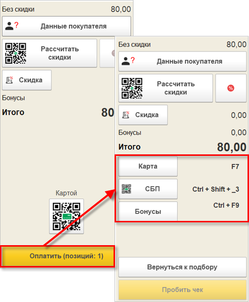 Если настройка «Напоминать ввести карту лояльности» выключена, то после нажатия на кнопку «Оплатить» сразу будет выполнен переход на этап оплаты.