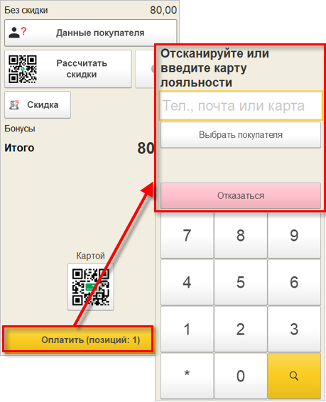 Если же настройка включена и карта не выбрана, то после нажатия на кнопку «Оплатить» будет предложено отсканировать или ввести карту лояльности покупателя. Здесь же можно выбрать клиента из списка покупателей или отказаться от ввода, сразу перейдя к оплате.