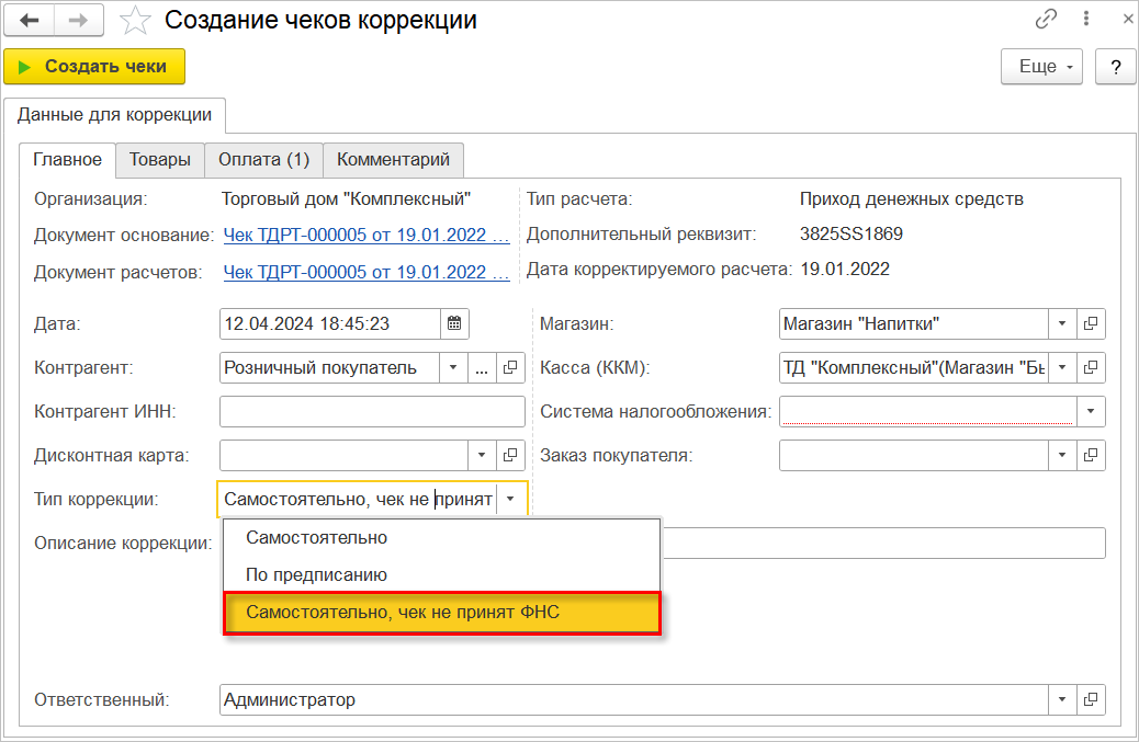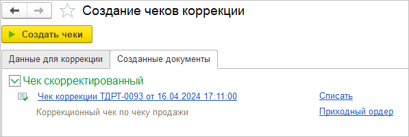 На странице созданных чеков отобразится только корректировочный чек,