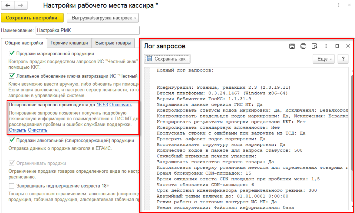 Добавлена возможность настройки дополнительного логирования запросов к ГИС МТ. Для записи логов необходимо перейти в раздел "Продажи" настроек РМК, для одноименной опции нажать ссылку "Включить" и выбрать длительность записи: 5, 10 или 15 мин.