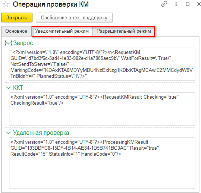 Все операции проверки кода маркировки в уведомительном и разрешительном режимах хранятся на одноименных вкладках.