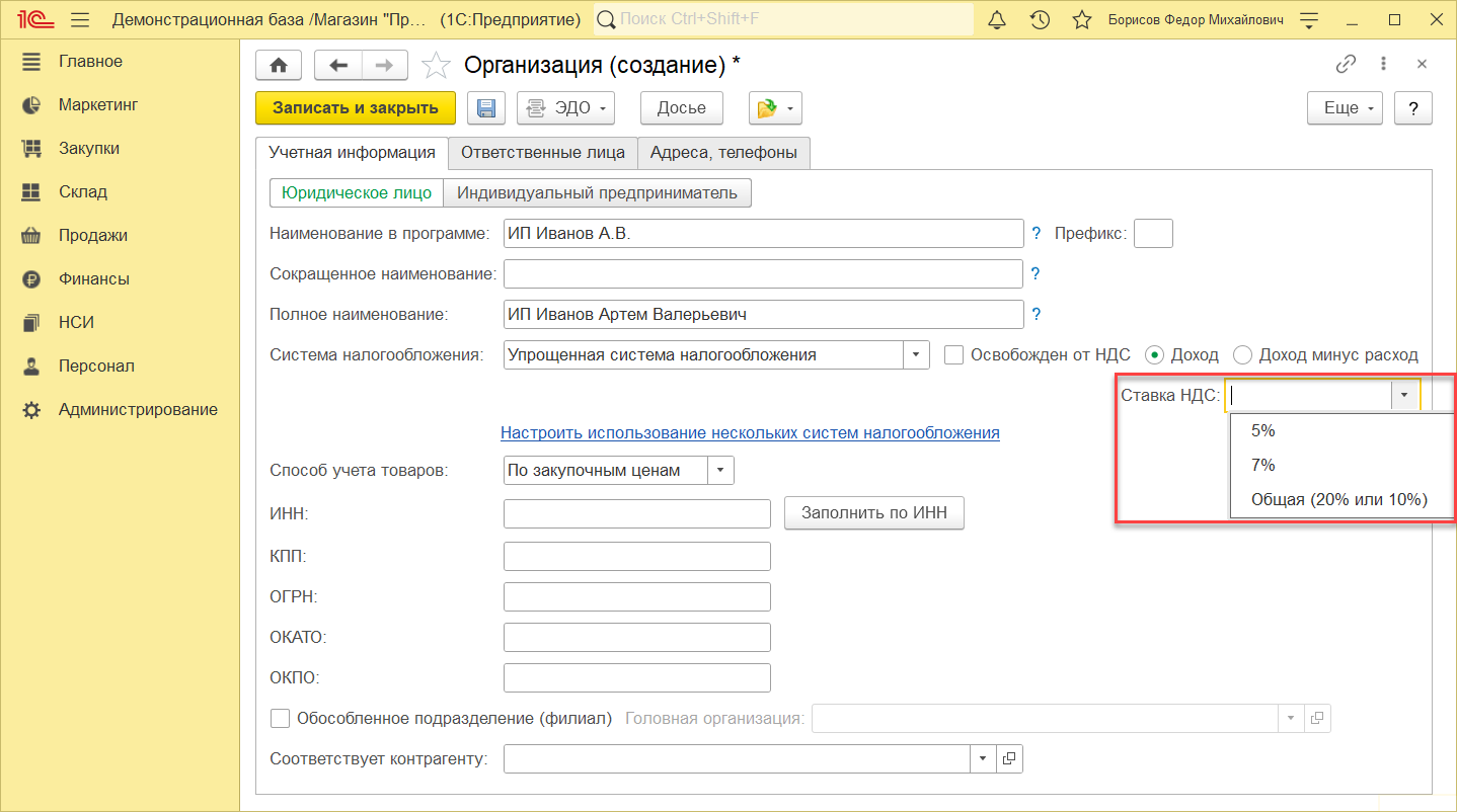 В программе поддержан учет НДС по ставкам 5 и 7% для предпринимателей,