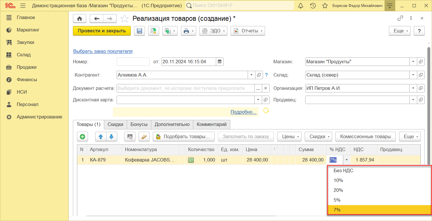 Но если настройки организации изменены, то ставка НДС будет подставляться из настроек автоматически, в том числе и при пробитии чеков из РМК.