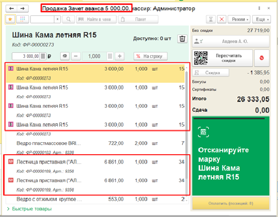 При внесении предоплаты по заказу вызвать список документов можно по кнопке Выбрать заказ в правой части экрана или по команде Продажа по заказу (предоплата) в меню Еще. В заголовке экрана отобразится номер выбранного заказа. Сумма аванса отобразится как в заголовке, так и в панели оплат возле кнопки Зачет аванса. При наличии в заказе маркируемых товаров и товаров с посерийным учетом, товары с количеством более 1 разворачивается построчно для ввода марок и серий.