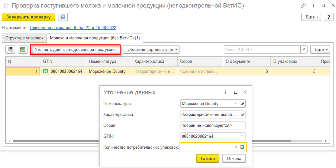 Аналогичным образом при оформлении оптовых продаж покупателям и возвратов поставщикам продукции с объемно-сортовым учетом данные заполняются в форме проверки и подбора маркируемой продукции.