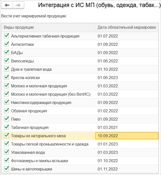 Для работы с изделиями из натурального меха по новым правилам необходимо установить флажок Товары из натурального меха в таблице используемых видов продукции (Настройки – Маркировка - Интеграция с ИС МП (обувь, одежда, табак…) – Вести учет маркируемой продукции).