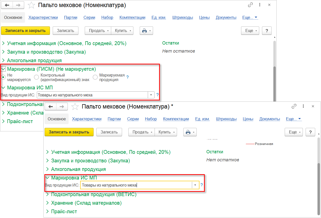 Чтобы облегчить переход в новую систему для существующих номенклатурных позиций ГИСМ программа самостоятельно заполнит вид продукции ИС значением Товары из натурального меха. А для остатков серий товаров ГИСМ будут автоматически сформированы записи в справочнике Штрихкоды упаковок и товаров. Для новых серий записи в данном справочнике будут формироваться автоматически при записи элемента.