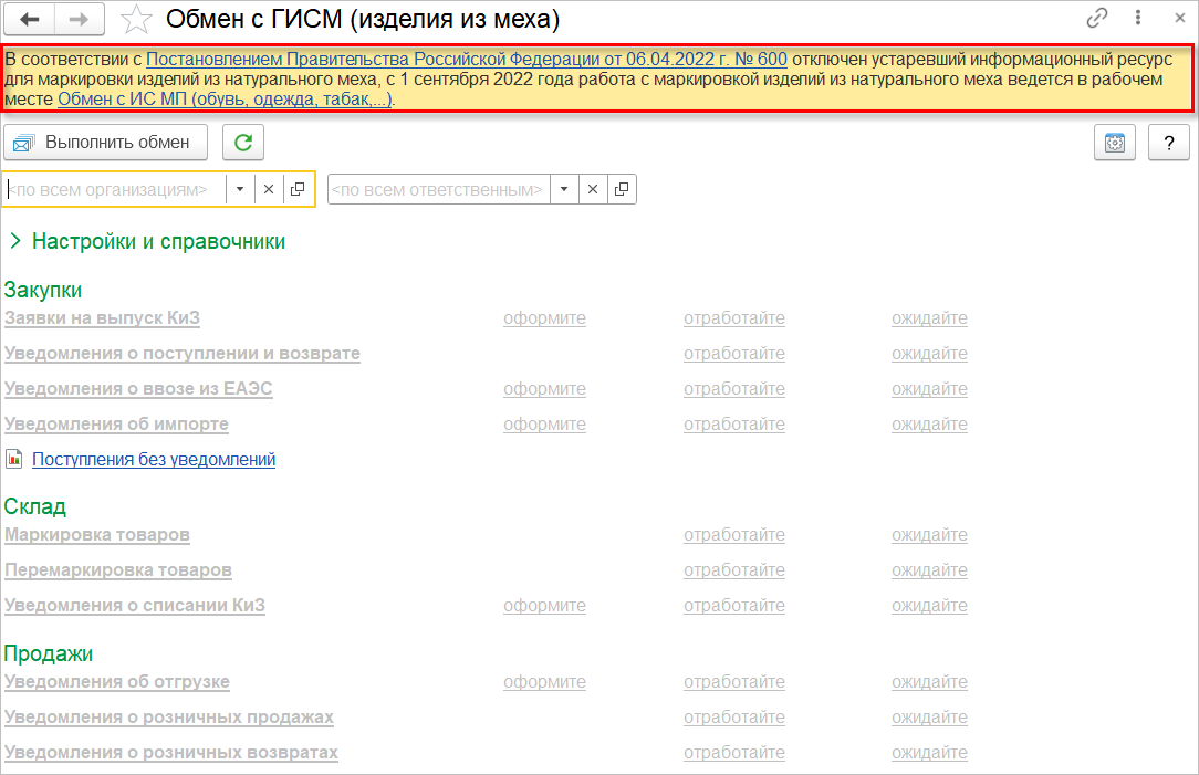 Если обновление на новый релиз было выполнено до наступления даты перехода, то в рабочем месте Обмен с ГИСМ (изделия из меха) (можно перейти из раздела Закупки) программа напомнит об отключении информационного ресурса маркировки меха и переходе в новое рабочее место.
