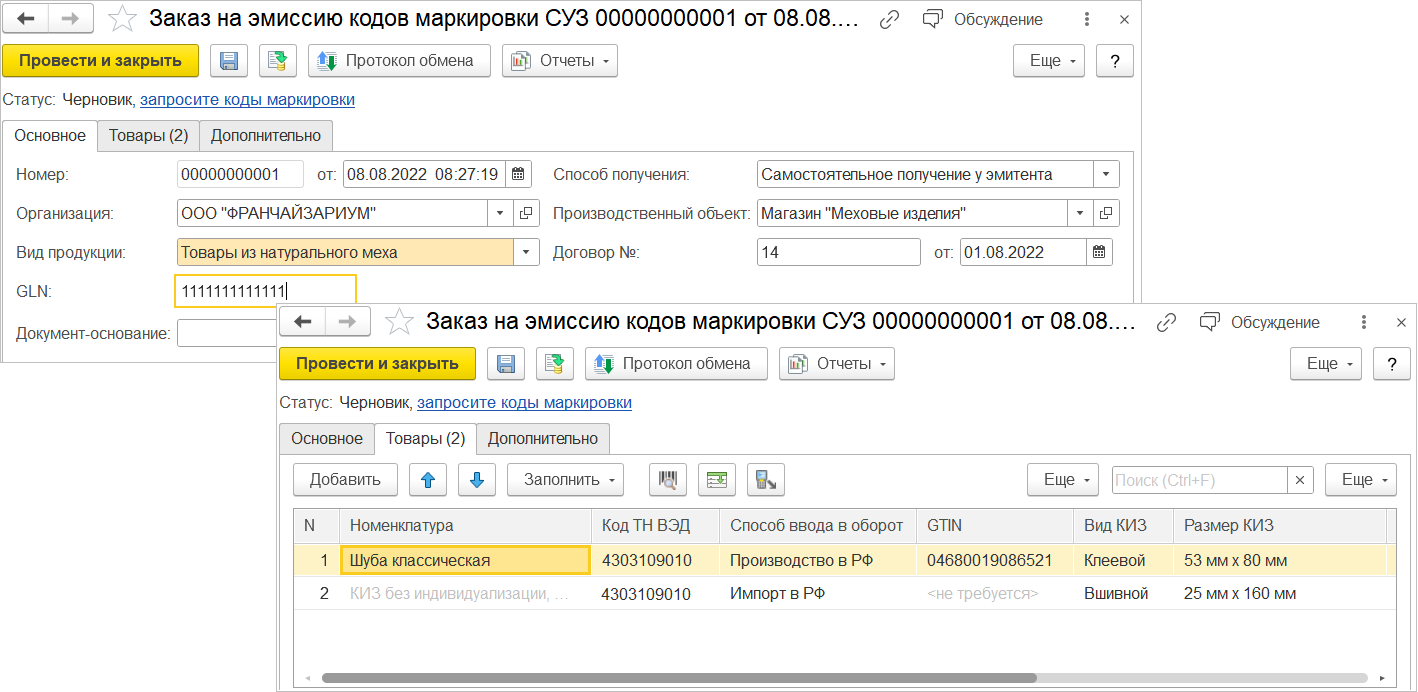 Для заказа КиЗ (кодов маркировки) для изделий из натурального меха используется документ Заказ на эмиссию кодов маркировки СУЗ с операцией Самостоятельное получение у эмитента.