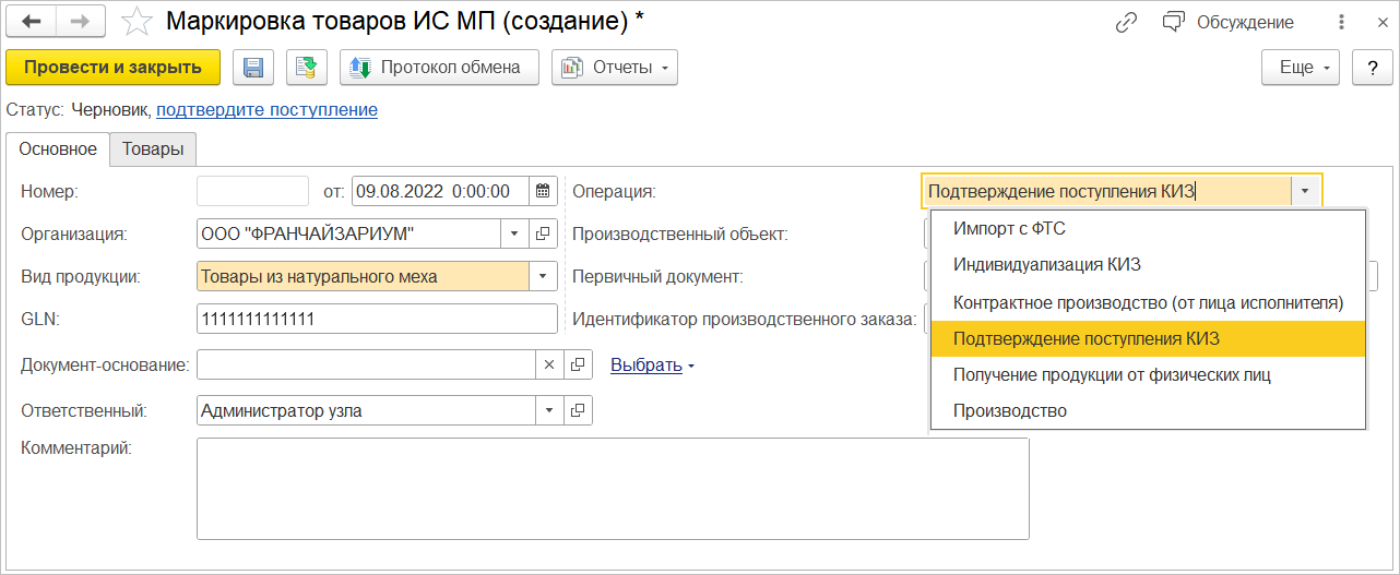 Так как КиЗ не передаются по ЭДО, то для отражения в ГИС МТ приемки меховых изделий от поставщика используется документ Приемка товаров ИС МП. Документ загружается из системы маркировки. В УПД КиЗ меховых изделий не указываются.