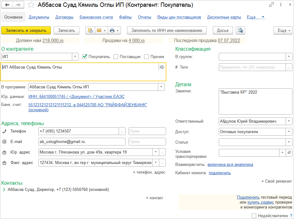 Оформить продажу оптом юридическому лицу или индивидуальному предпринимателю с целью последующей перепродажи можно для любого товара, в том числе и маркированного средствами идентификации. Сведения о продажах таких товаров будут переданы в систему маркировки "Честный знак". В случае работы с юридическими лицами сохраняются контактные данные представителей контрагента. Реализовано ведение раздельных баз клиентов по группам доступа и быстрый отбор контрагентов в списках с помощью назначенных тегов.