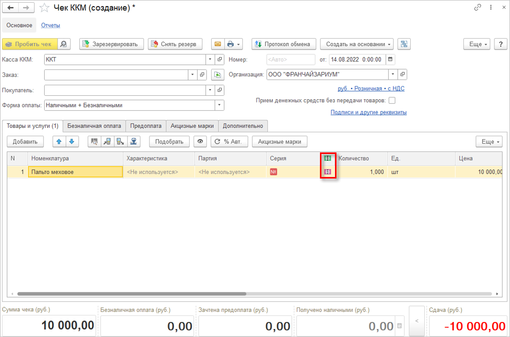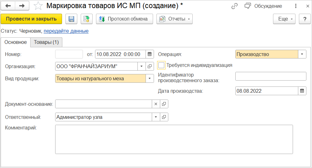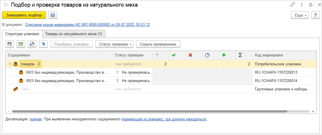 Для ввода кодов в оборот предназначен документ Маркировка товаров ИС МП. Но в данном документе для изделий из натурального меха предусмотрены и дополнительные операции.
