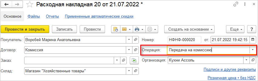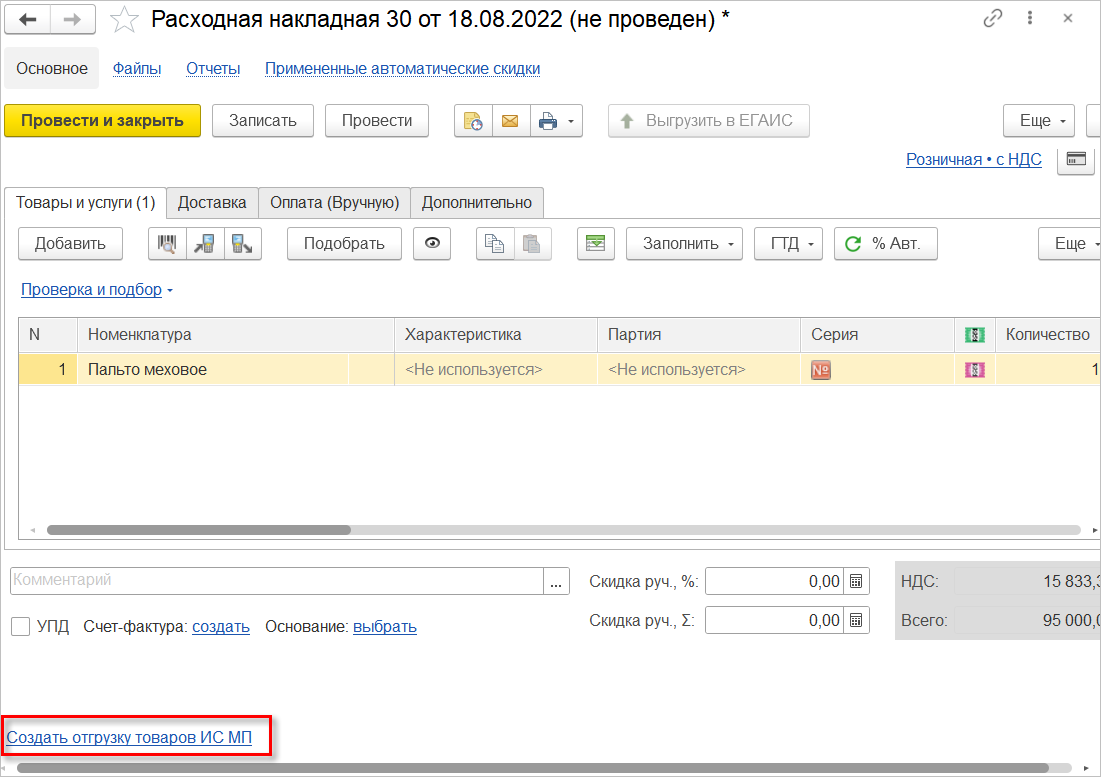 Так как КиЗ не передаются по ЭДО, то для отражения в ГИС МТ оптовой продажи меховых изделий используется документ Отгрузка товаров ИС МП. В УПД КиЗ меховых изделий не указываются. Документ можно создать по одноименной ссылке из «Расходной накладной».