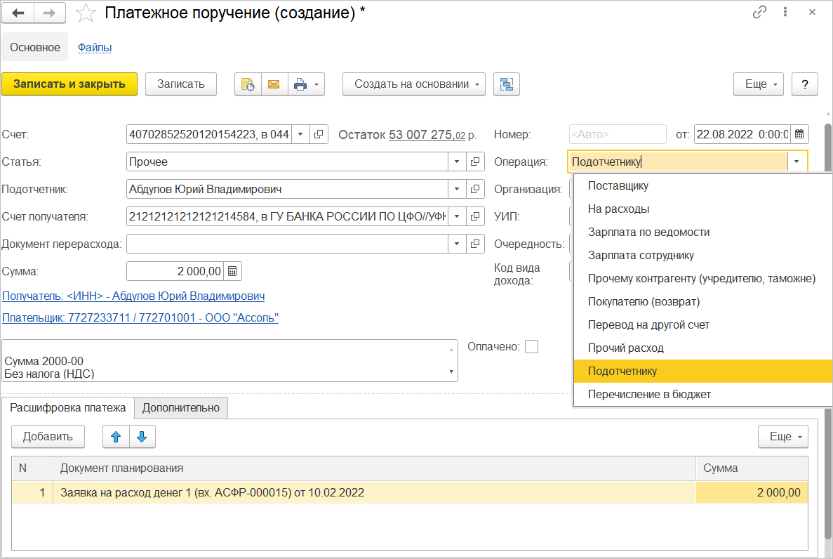 Формирование и передача в банк платежных поручений и расширение списка поддерживаемых операций по кассе и банку позволяют замкнуть контур учета денежных средств. Помимо расчетов с клиентами и поставщиками можно зафиксировать операции с прочими поставщиками, расчеты с подотчетниками, учесть отчеты эквайера, комиссию банка, переводы между счетами, а также личные средства предпринимателя.