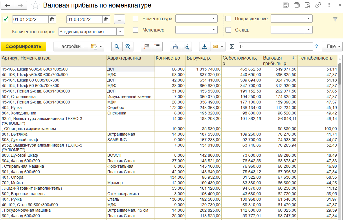Отчет о валовой прибыли теперь носит не оценочный характер, а формируется на основании рассчитанной себестоимости товаров. Это позволяет получить более точную информацию о валовой прибыли и рентабельности отдельных товаров, товарных категорий, магазинов. Отчет также удобен для анализа прибыли от покупок, совершенных определенными группами покупателей. Формируется отчет «Доходы и расходы (по оплате)», таким образом можно оперативно видеть рассчитанные доходы, расходы и прибыль кассовым методом на основании поступлений и выплат денежных средств.
