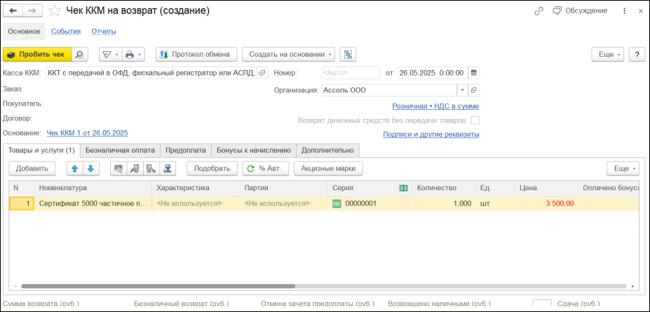 Снизили вероятность ошибки при оформлении возврата подарочного сертификата. Теперь система автоматически определяет сумму, по которой следует отразить возврат сертификата. Для документов "Чек ККМ" и "Приходная накладная" с видом операции «Возврат от покупателя» цена строк с подарочными сертификатами определяется остатком на балансе сертификата.