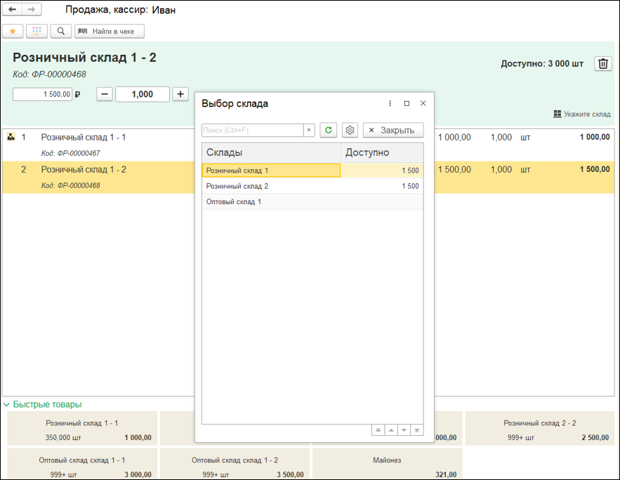 В плиточном интерфейсе, подборе и "быстрых товарах" отображается общий остаток по всем складам. На форму выбора склада так же вынесены остатки в разрезе складов. При выборе конкретного склада остаток в шапке изменится на остаток конкретного склада.