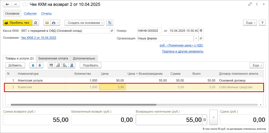 Кроме того, теперь при розничной продаже агентских услуг заполняется сумма расчетов с контрагентом-принципалом. Это позволит анализировать данную информацию в соответствующих отчетах.