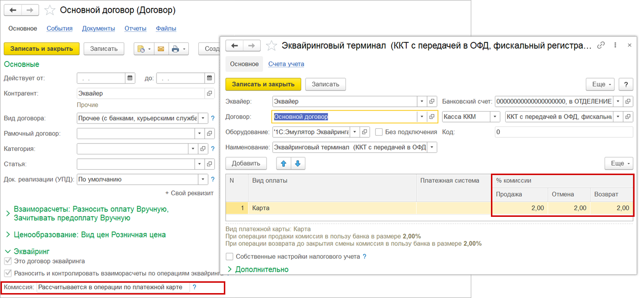 В договоре эквайера можно указать различные варианты расчета комиссии: рассчитывать в операции эквайринга или указывать вручную в отчете эквайера.