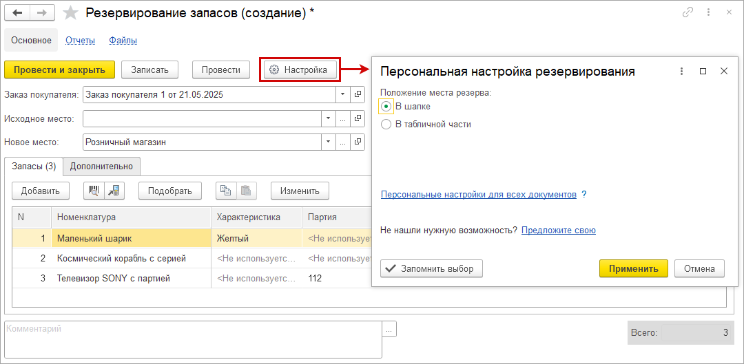 На форму добавлена настройка отображения полей. С ее помощью можно выбрать, как заполнять место резервирования: для каждого товара, или для всего документа.