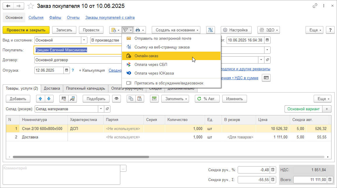 Отправить ссылку на оплату становится проще и быстрее. Теперь отправить онлайн-заказ, ссылку на оплату, в том числе через СБП и ЮKassa можно единой кнопкой “Отправить”. Этой же командой можно воспользоваться для перехода в веб-витрину mag1С и на видеовстречу. Возможность "Поделиться документом" перенесли в подменю "ЭДО".