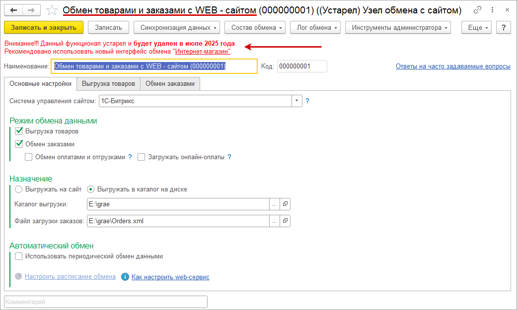 С июля 2025 года устаревший механизм "Обмен с сайтом" будет автоматически заменен на обновленный "Интернет-магазин" и полностью удален из программы.